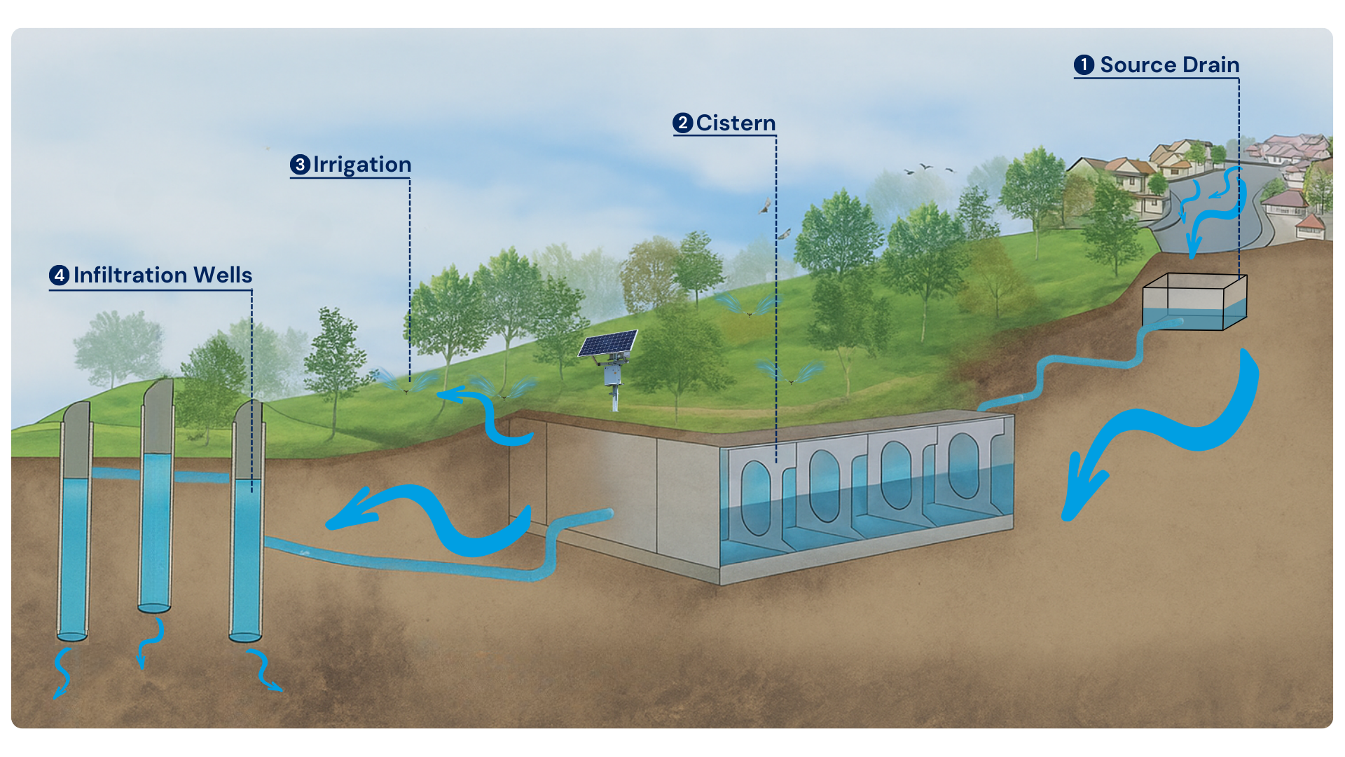 The Gates Canyon Park stormwater capture and reuse system utilizes continuous monitoring and adaptive control (CMAC) to meet water quality improvement and reuse objectives at a single facility. The system is configured to optimize the facility's storage capacity by constantly maintaining a reservoir of water for use as irrigation within the park while also reserving space for unexpected inflows. The CMAC system prevents overflows from the system by continuously monitoring the 72-hour weather forecast and preparing the system for predicted rain events. If a storm is predicted, the system will proactively drain water from the cistern by pumping it into a series of infiltration wells, making room for the incoming storm. If the cistern water level exceeds the target reservoir volume for any reason, it will also reactively pump out the excess water to maintain its target levels.